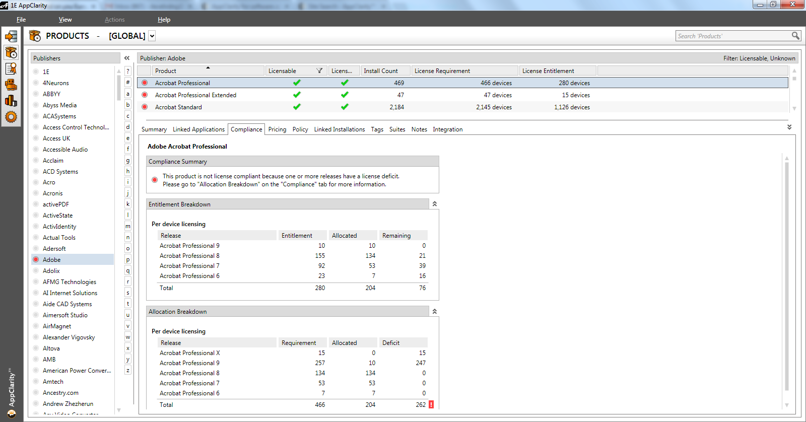 AppClarity can import Adobe License entitlements and work with inventory sources to provide a clear view on Adobe compliance and efficiency. The inbuilt AppClarity software catalogue and analytics engines works to filter out irrelevant configuration noise, group Adobe installs into common families and identify those Adobe installs that require a license. Whilst we didn’t perform rigorous benchmarking of the Adobe recognition capabilities of 1E the technology certainly does a good job of pointing users to the most pertinent information and sorting the wheat from the chaff.