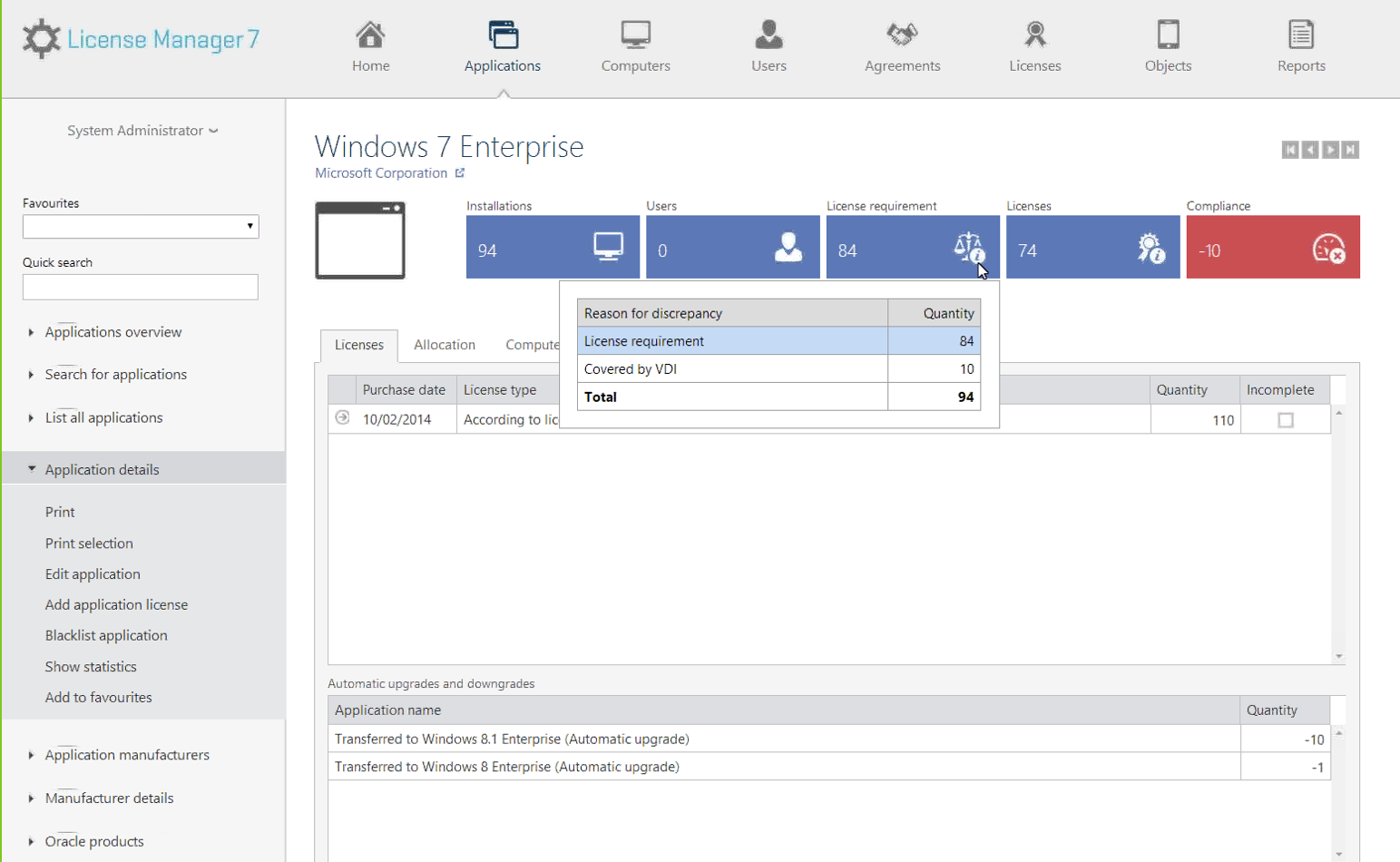 For difficult-to-manage licenses schemes such as secondary use rights and Virtual Desktop Access (VDA), Snow License Manager makes it easy for organizations to determine the actual software usage and corresponding license requirement. This can then be instantly compared against the entitlements in the intelligent repository.